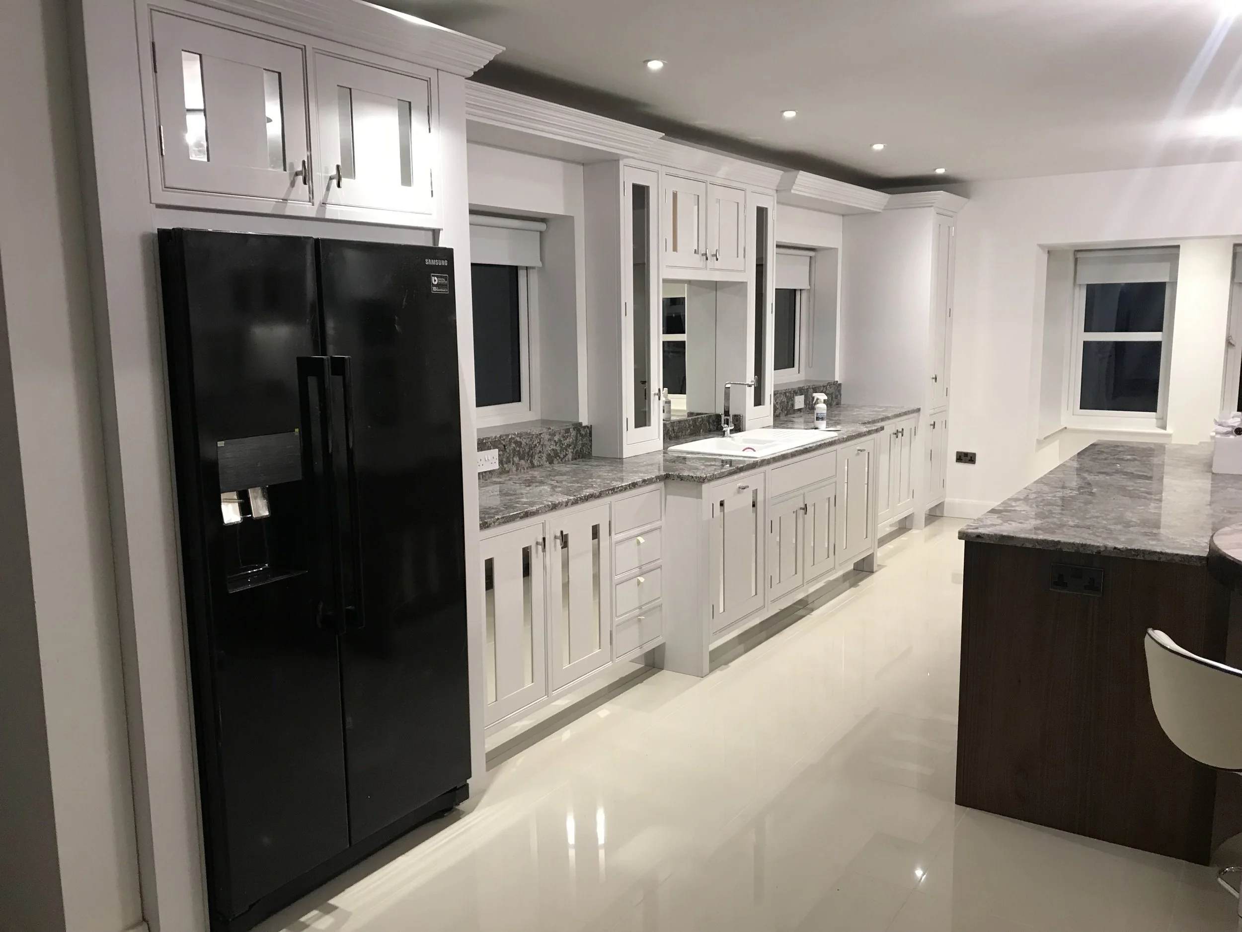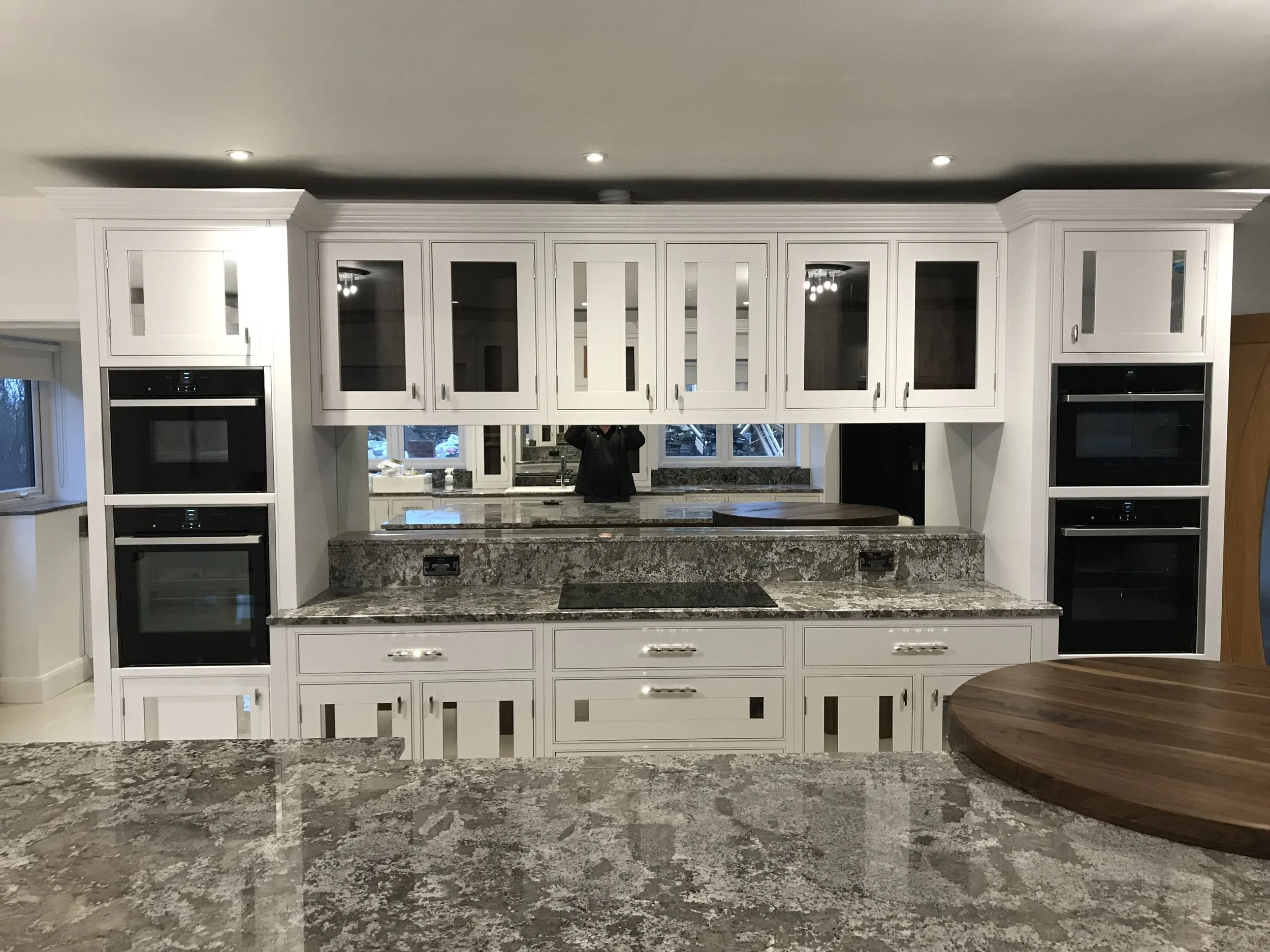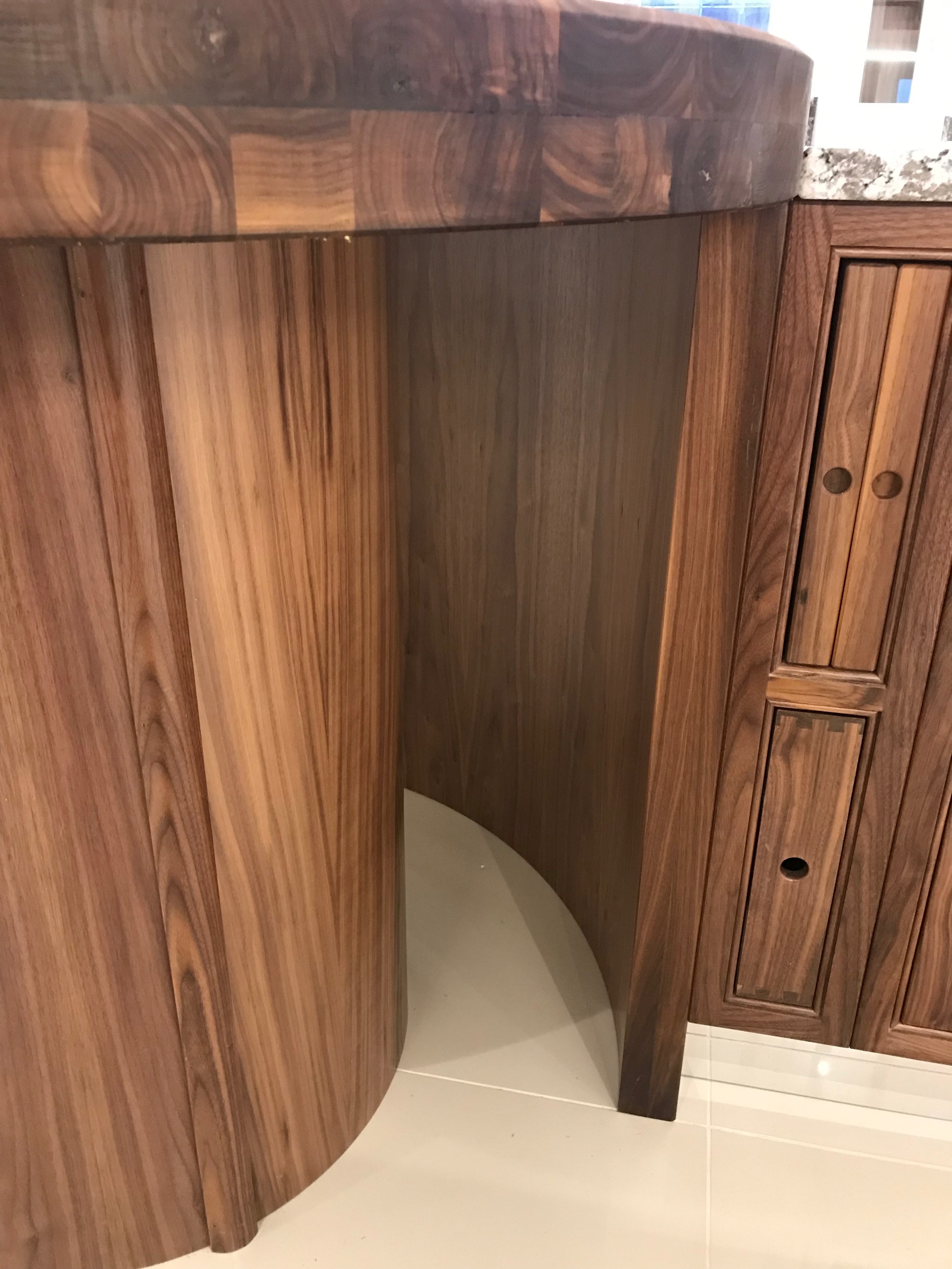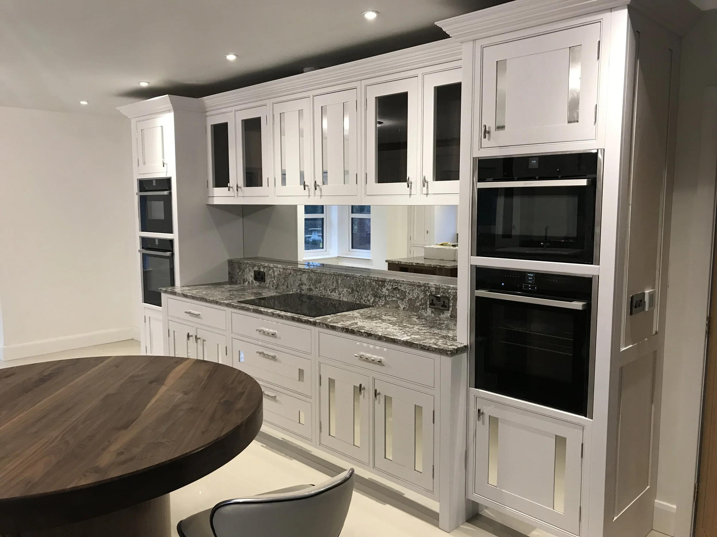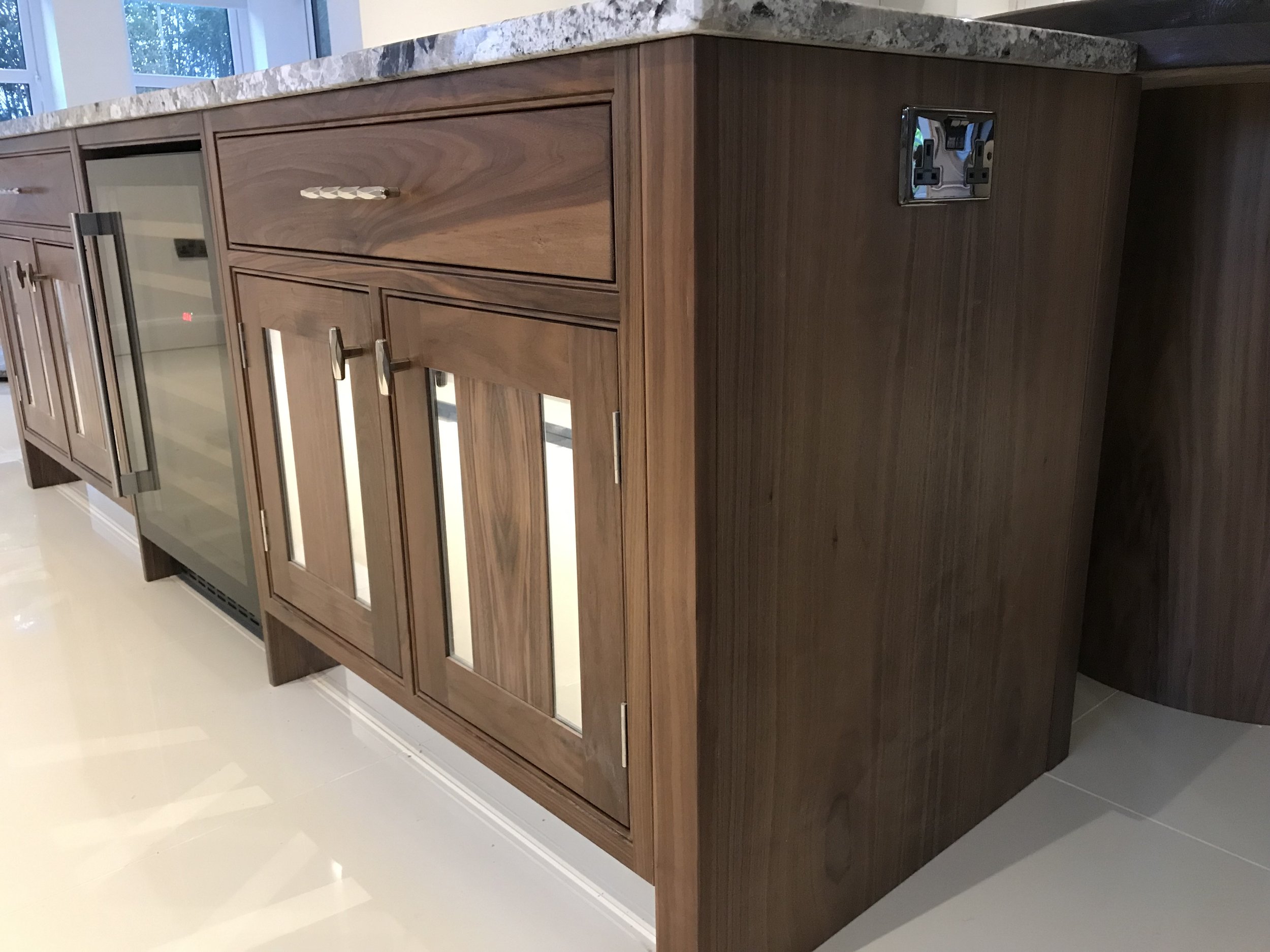 Striking contemporary style kitchen with heavily figured grissard feature doors